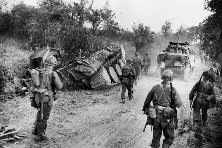 Photo Credit: U.S. infantry pass German tanks as they advance Carentan in Normandy via Getty Images