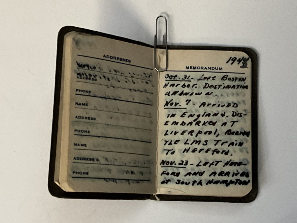 The first entries of that journal mark the opening steps of a story that would eventually lead not only through war, but toward the life he would build after returning home. The timeline of his journey began on “October 31, 1944. The young soldier left Boston Harbor, destination unknown.”