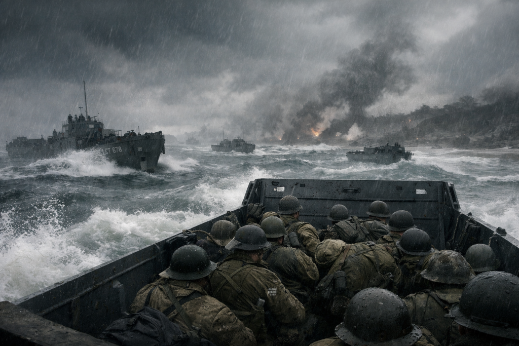 Artistic reconstruction of Allied land craft approaching the Normandy coast during rough English Channel weather in World War II. Used here to illustrate the conditions soldiers experienced when crossing to France. By late November 1944, Allied forces had already secured much of Normandy following the landings on Utah Beach and Omaha Beach during D-Day.