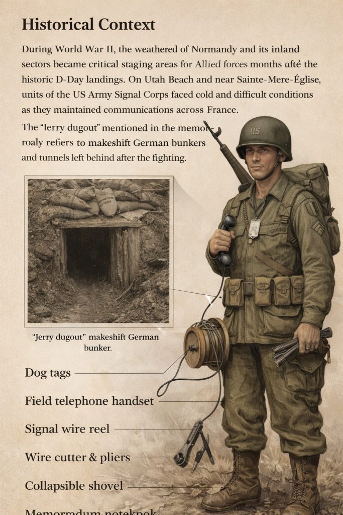 Field technicians often carried wire reels, telephone handsets, pliers, and cutting tools used to install communication lines between command posts and frontline units. These tools allowed Allied forces operating near Utah Beach and Sainte-Mère-Église to remain connected as operations moved inland.