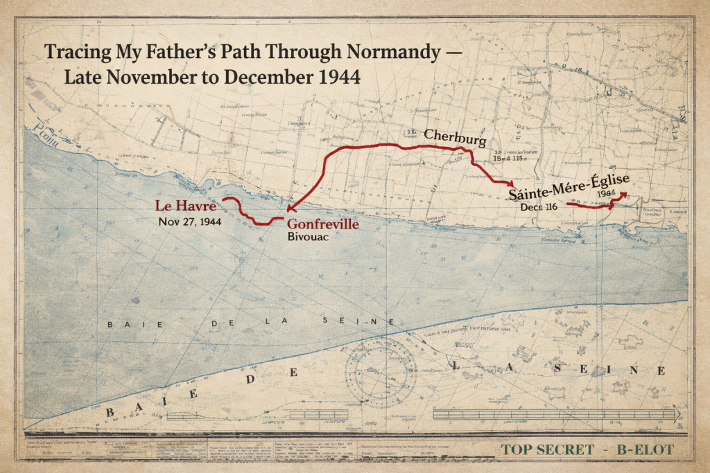 Using locations recorded in my father’s memorandum, I traced the route of his movement through Normandy: Le Havre → Gonfreville → Cherbourg → Sainte-Mère-Églis