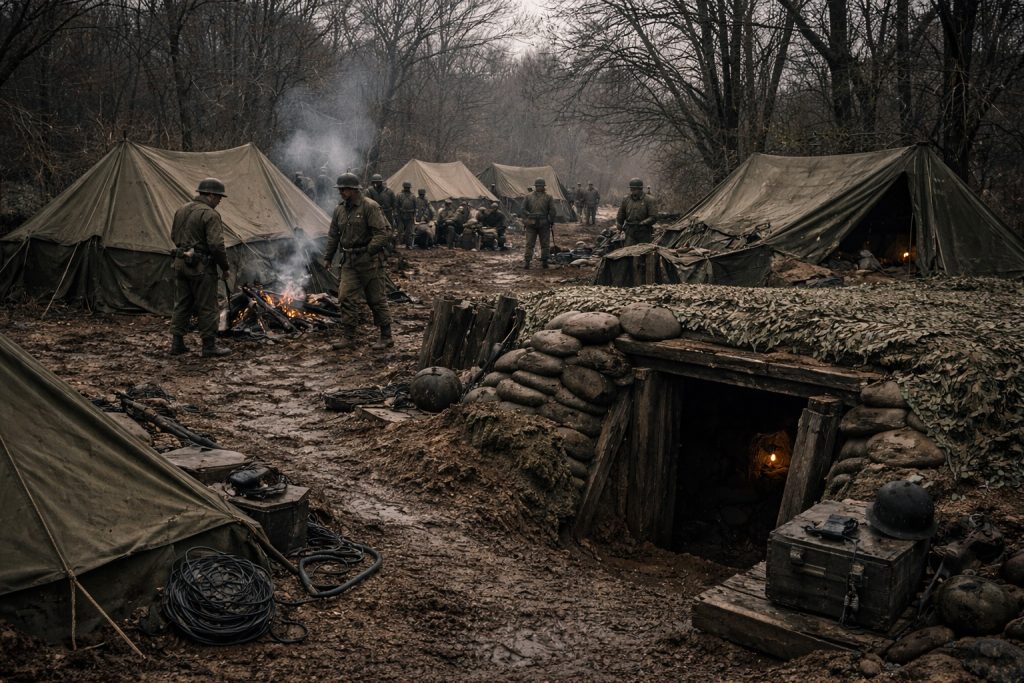 A temporary Signal Corps encampment near Gonfreville, France, November 1944. Soldiers often bivouacked in conditions like these while awaiting movement and maintaining operations. My father remained bivouacked in this area for approximately two weeks.