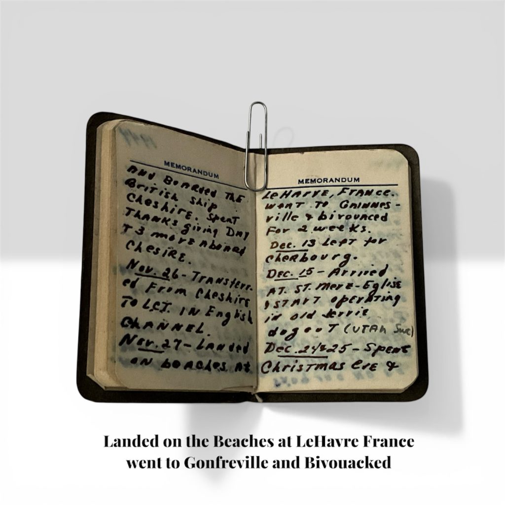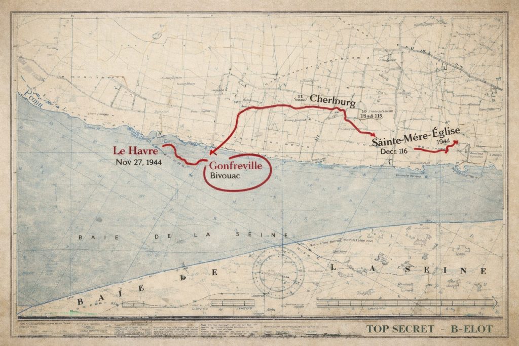 November 27 – Landed on beaches at LeHavre, France. Went to Gonfreville, France & bivouacked for 2 weeks.