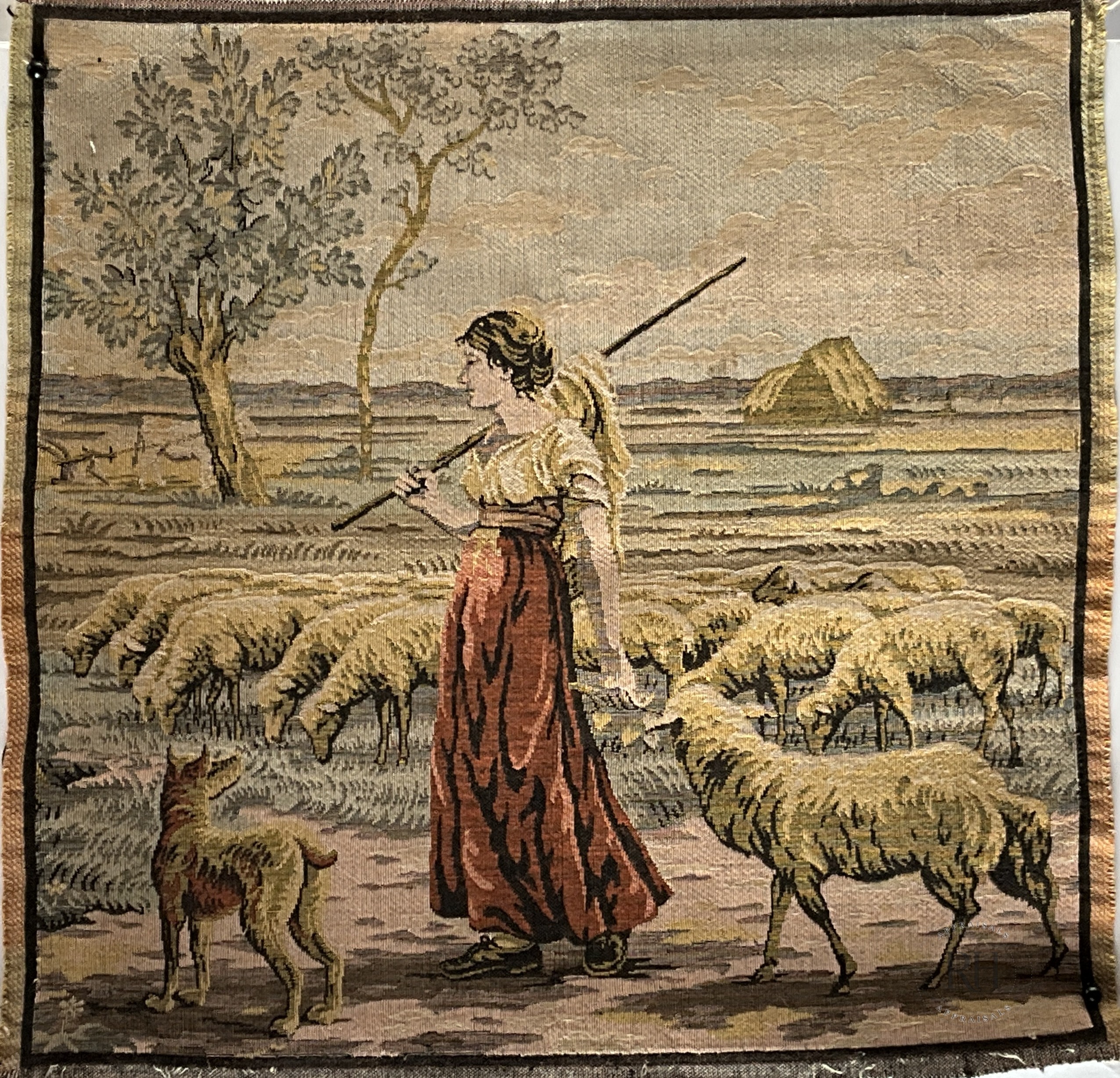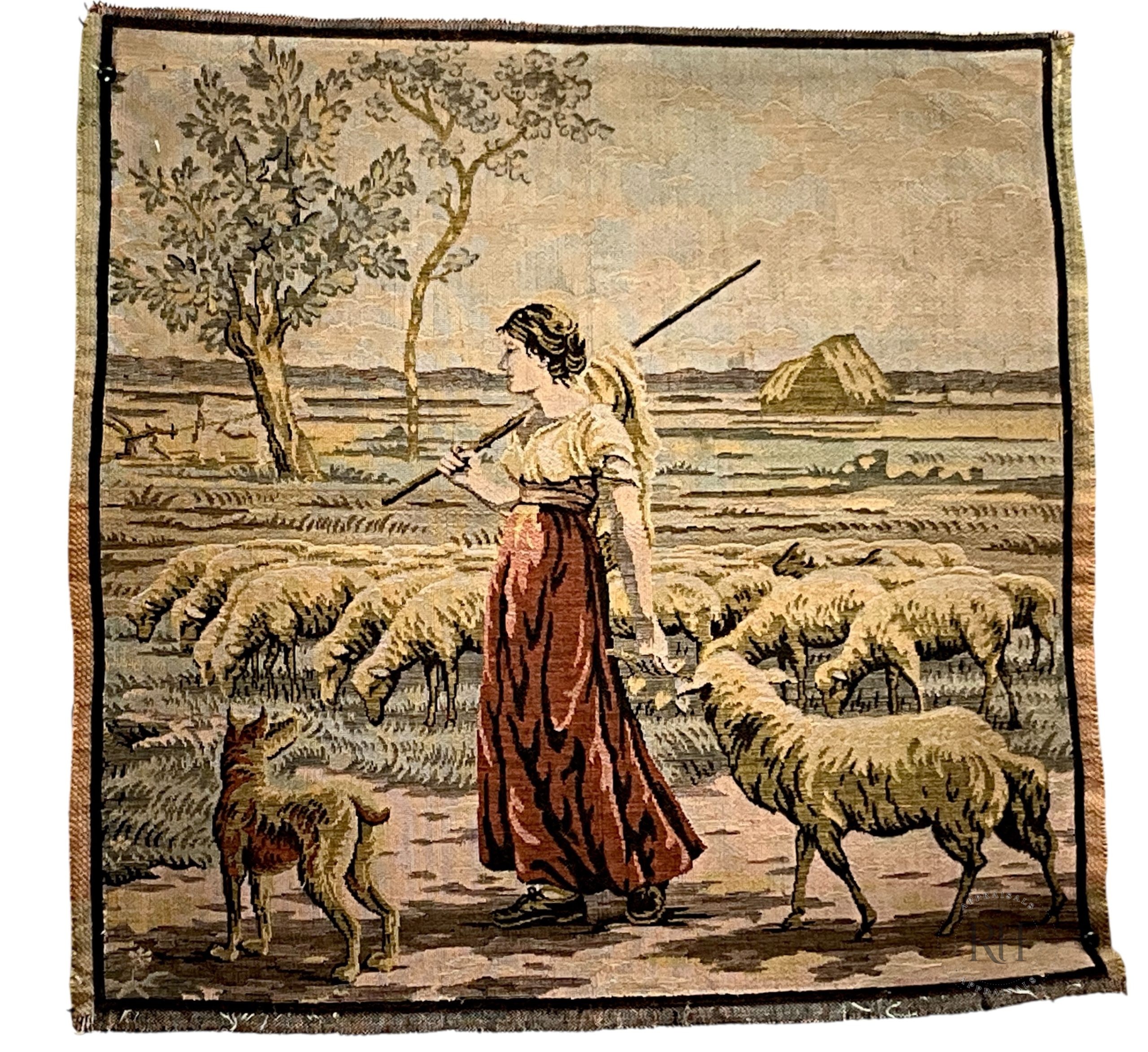 A woven pastoral scene unfolds across this matched pair, depicting a shepherdess within a quiet landscape of grazing flock and open horizon.