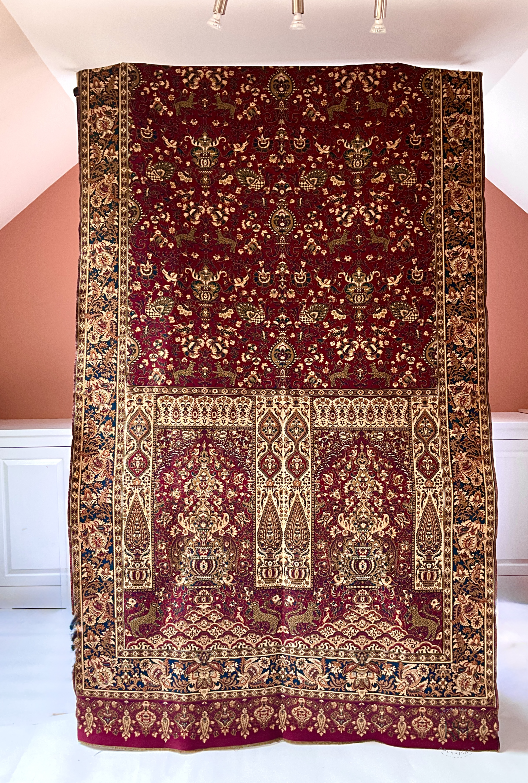 A matched pair of jacquard woven textile panels presented in two distinct palettes - burgundy and ivory - each carriying the same mirrored composition.